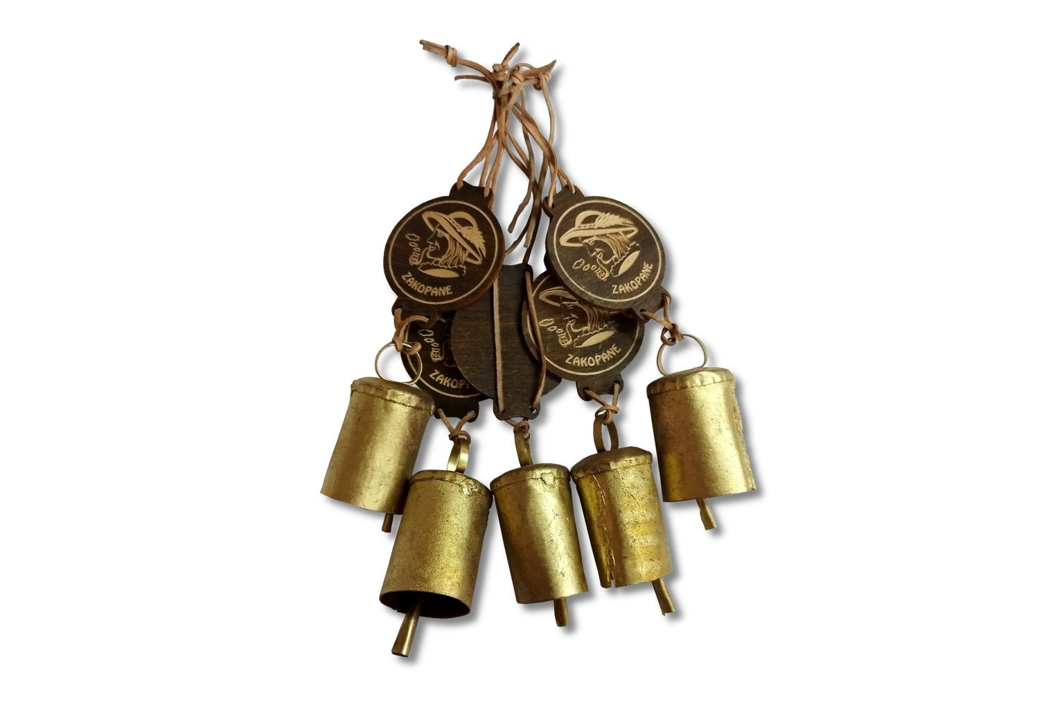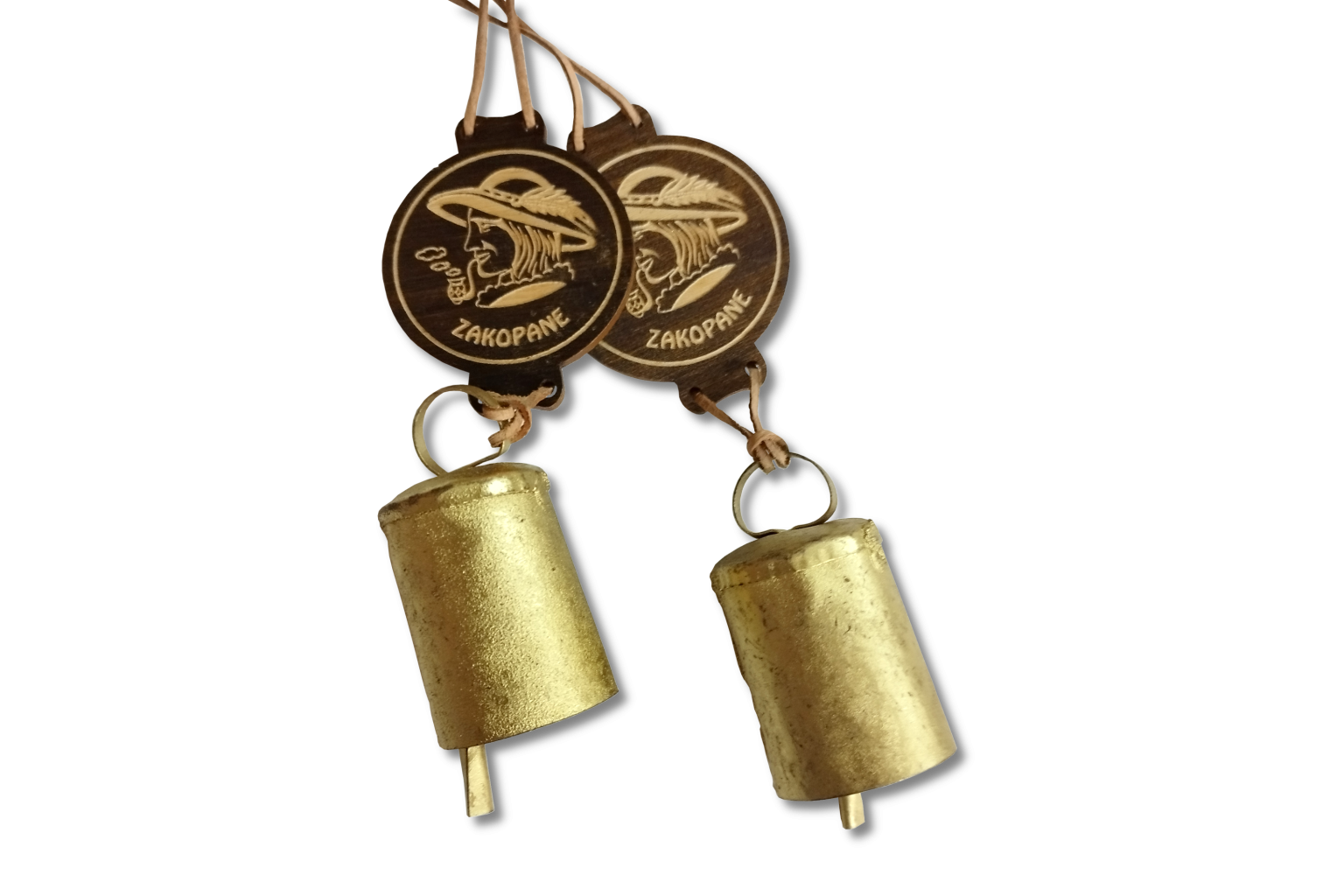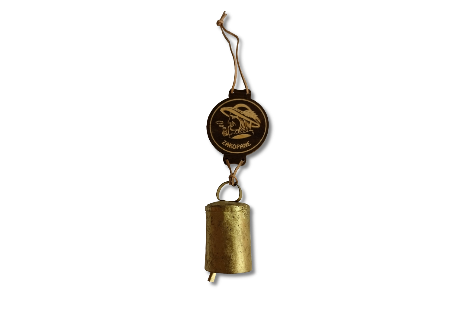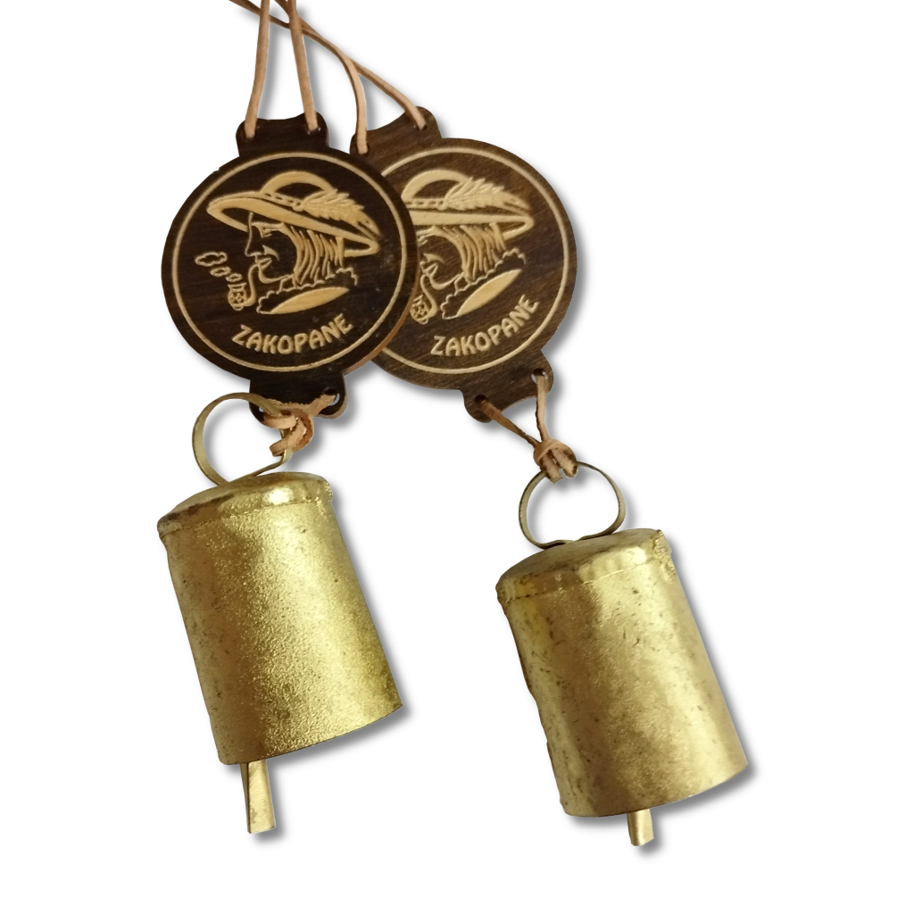 Unikalna góralska pamiątka z serca Tatr. Plakietka wykonana jest z ciemnego drewna z grawerunkiem przedstawiającym profil górala w kapeluszu oraz napisem „Zakopane”. Całość uzupełnia mosiężny dzwonek, zawieszony na skórzanym rzemyku, który wydaje przyjemny, rustykalny dźwięk.
