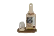 Na zdjęciu przedstawiono drewnianą pamiątkę w formie ozdobnego stojaka. Składa się z deseczki z uchwytem na górze, na której znajduje się wizerunek niedźwiedzia, termometr oraz humorystyczny napis: „Pijmy wódkę, jedzmy śledzie, a będziemy jak niedźwiedzie”. Pod deseczką umieszczona jest drewniana podstawka z wyżłobieniem na kieliszek, który stoi odwrócony do góry dnem. Kieliszek jest wykonany ze szkła i ma delikatne niebieskie zabarwienie. Termometr zamontowany po prawej stronie deseczki wskazuje temperaturę w dwóch skalach: Celsjusza (°C) i Fahrenheita (°F). Pamiątka ma żartobliwy charakter i nawiązuje do tradycyjnych polskich zwyczajów związanych z biesiadą i spożywaniem alkoholu. Ozdobne elementy oraz motyw niedźwiedzia dodają jej rustykalnego uroku.