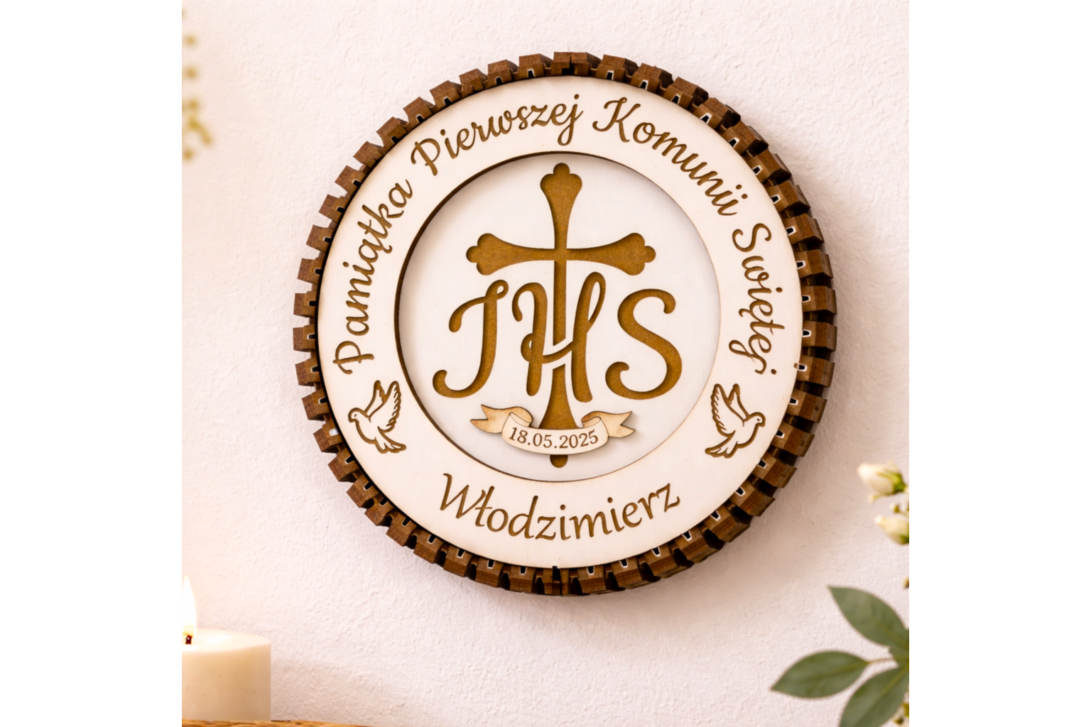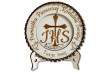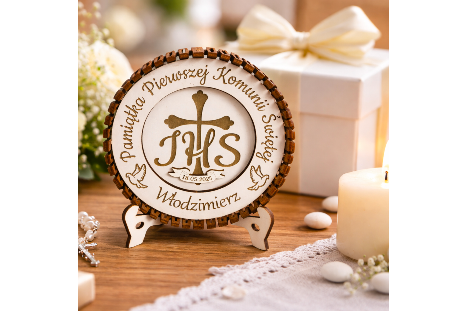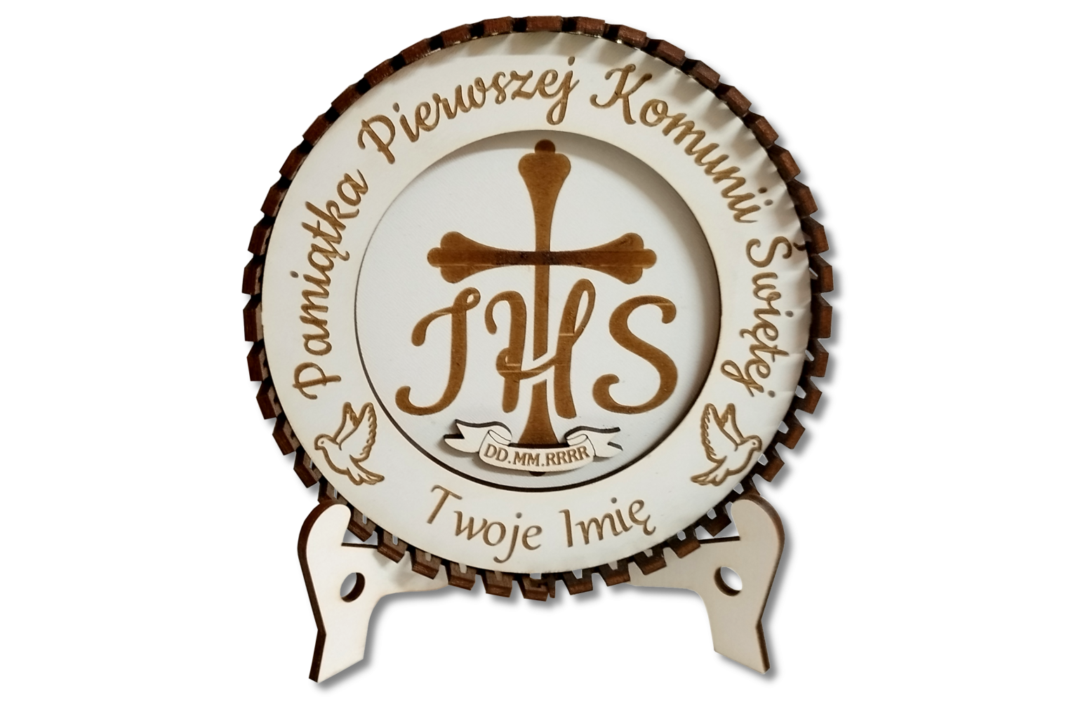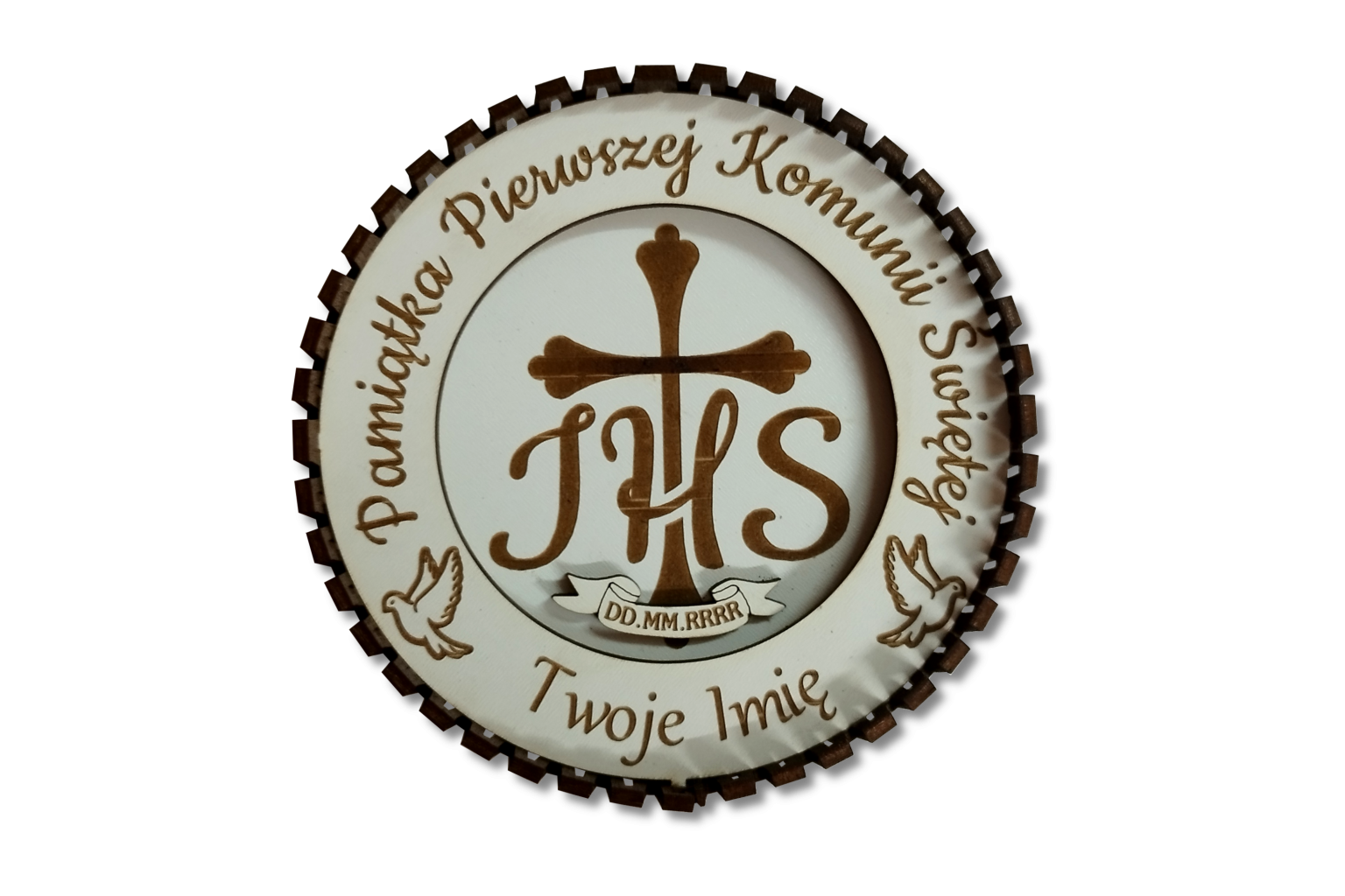 Wyjątkowa, okrągła pamiątka Pierwszej Komunii Świętej wykonana z precyzyjnie grawerowanej sklejki. Centralny motyw stanowi symbol IHS z krzyżem, pod którym umieszczona jest data uroczystości – możliwość zmiany daty według życzenia klienta.