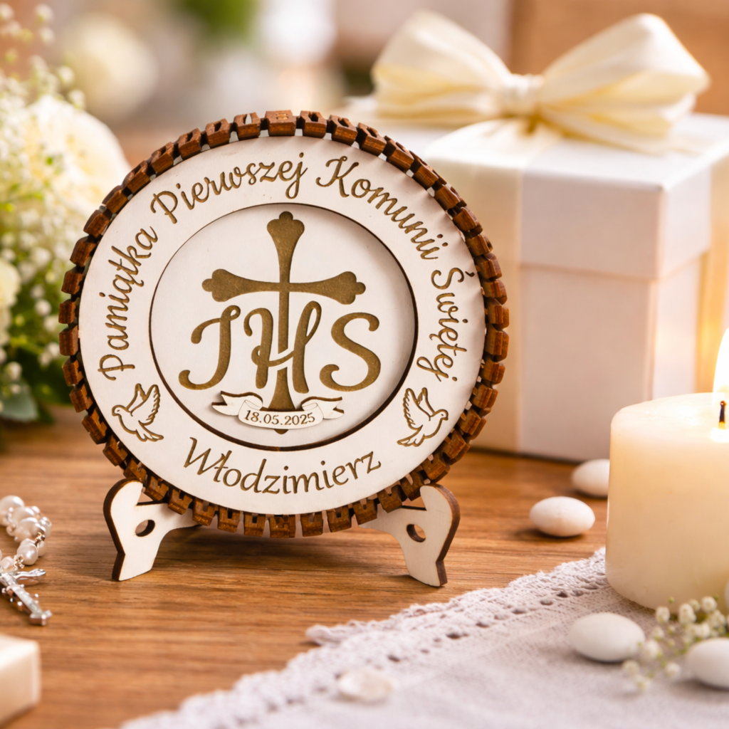 Drewniana Pamiątka Pierwszej Komunii Świętej – okrągła z personalizacją