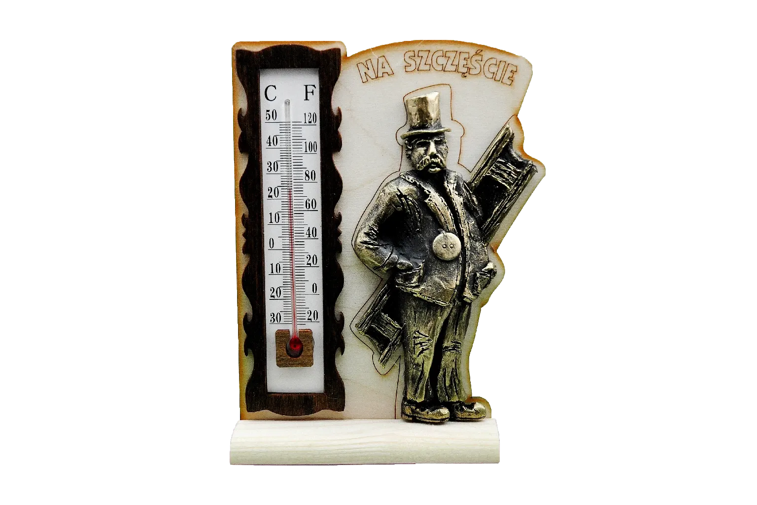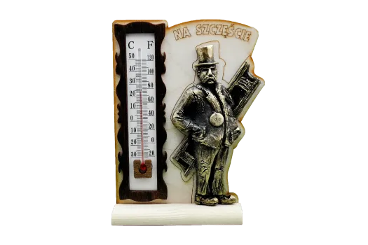 Po prawej stronie termometru znajduje się trójwymiarowa figura mężczyzny ubranego w starodawne ubranie, prawdopodobnie kominiarz, trzymającego drabinę z kapeluszem na głowie. Figura dodaje projektowi antycznego i rustykalnego charakteru. Nad figurą znajduje się fraza „NA SZCZĘŚCIE ”