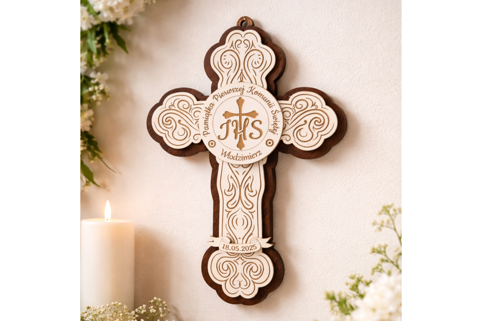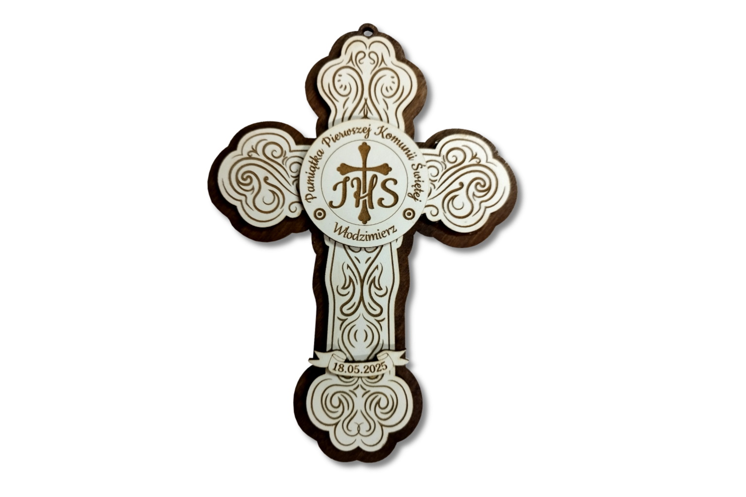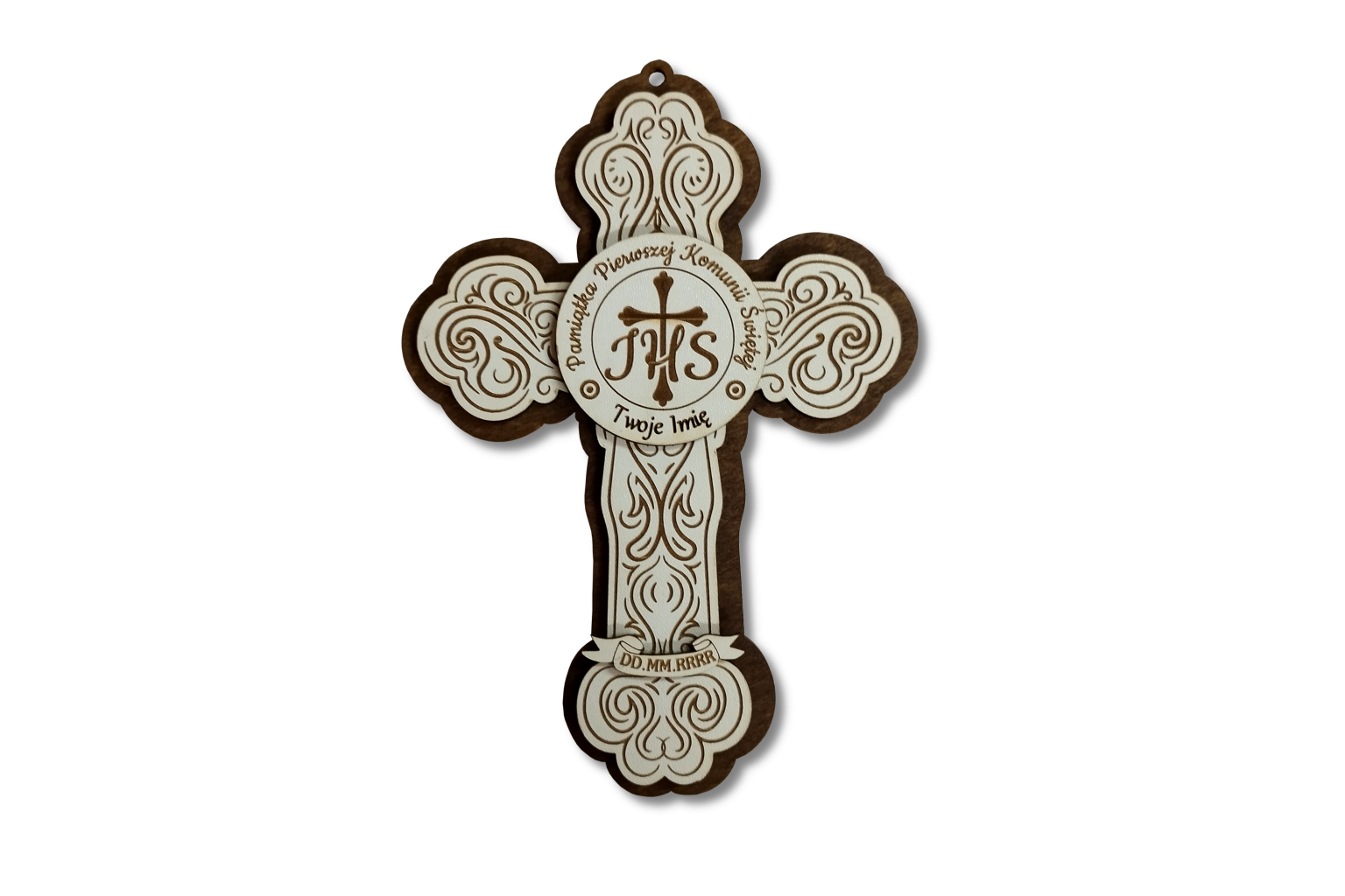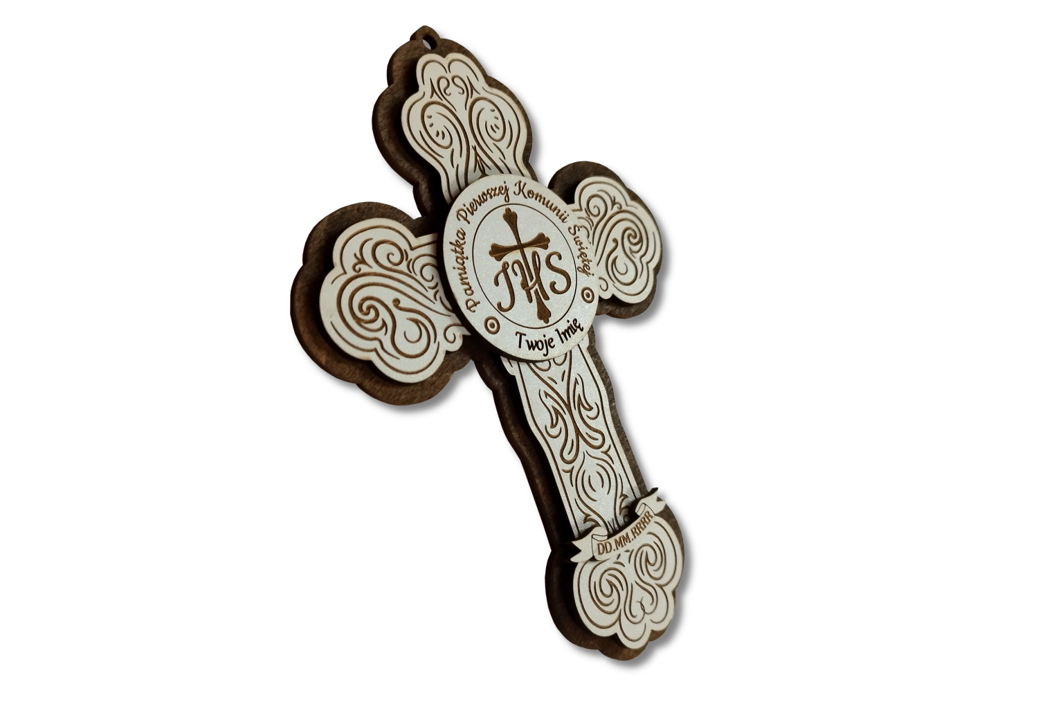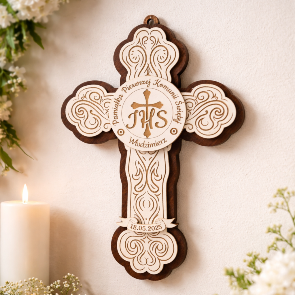 Elegancka pamiątka Pierwszej Komunii Świętej w formie ozdobnego krzyża, wykonana z wysokiej jakości sklejki w dwóch kontrastujących odcieniach – jasnym i ciemnym. Centralny element stanowi plakietka z symbolem IHS oraz krzyżem, otoczona napisem: „Pamiątka Pierwszej Komunii Świętej”.