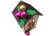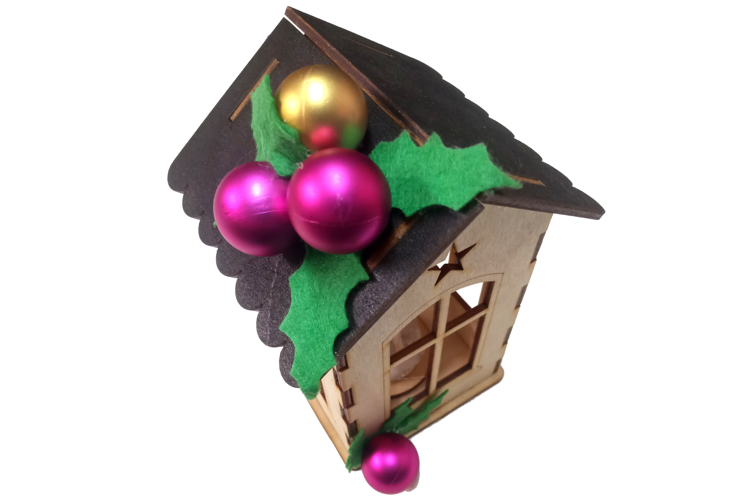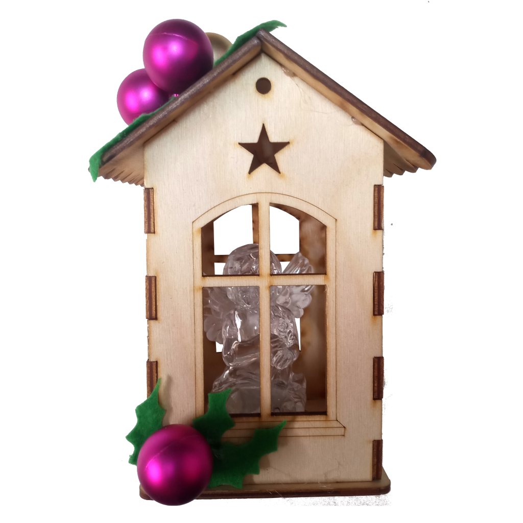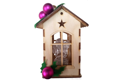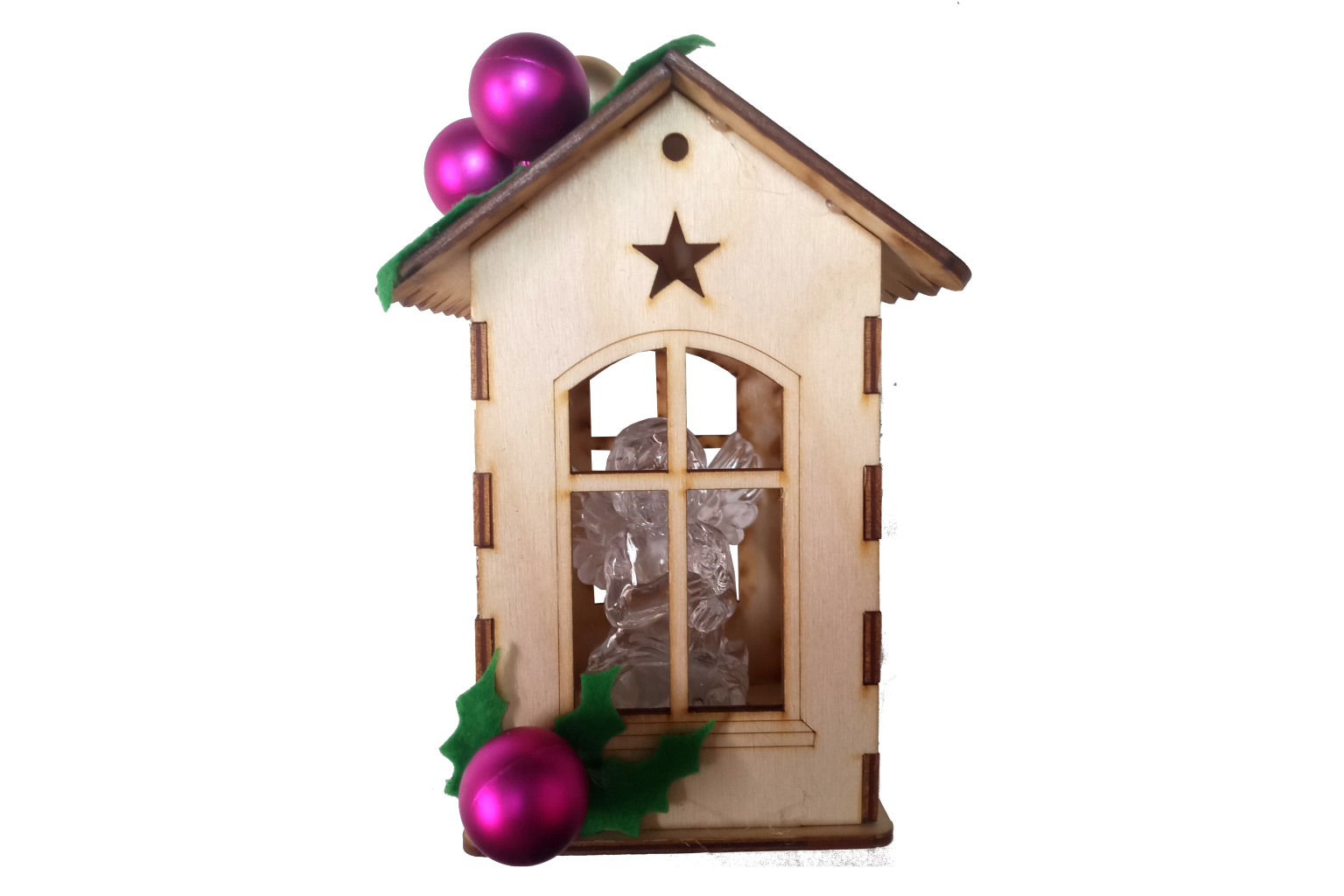 Drewniana dekoracja świąteczna w formie lampionu, przypominająca uroczy domek. Na dachu znajdują się filcowe listki ostrokrzewu i błyszczące, fioletowe bombki, które podkreślają świąteczny charakter ozdoby. Przez okienko lampionu widoczna jest subtelna, szklana figurka, dodająca całości elegancji i delikatnego blasku.Ta ręcznie wykonana dekoracja idealnie nadaje się do ozdobienia stołu, półki lub parapetu, wprowadzając do wnętrza ciepłą, bożonarodzeniową atmosferę. Wykonana z naturalnego drewna, świetnie komponuje się z aranżacjami w stylu rustykalnym, skandynawskim czy klasycznym. To doskonały pomysł na świąteczny prezent lub wyjątkowy dodatek do Twojego domu.