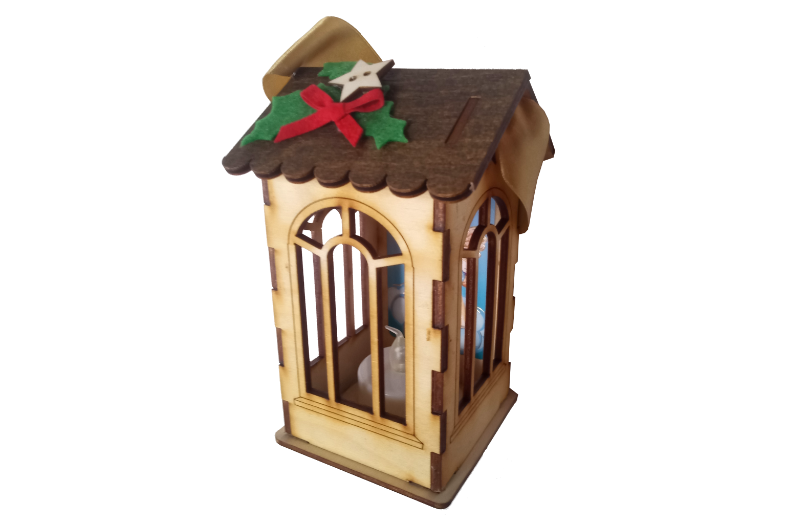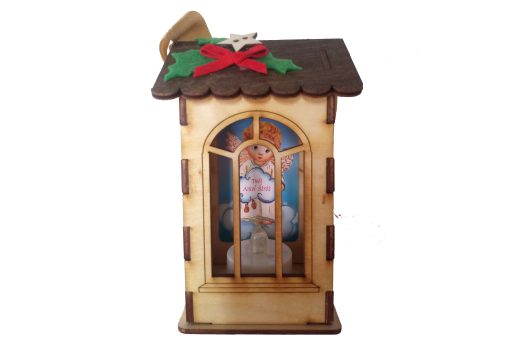 Drewniany lampion dekoracyjny w kształcie domku z uroczym motywem anioła i napisem „Twój Anioł Stróż”. Wykonany z naturalnego drewna, posiada wycięte okienko w kształcie łuku, przez które widoczny jest kolorowy wizerunek anioła. Dach lampionu zdobi filcowa dekoracja w postaci zielonych listków, czerwonej kokardki i drewnianej gwiazdki, nadając całości świątecznego charakteru. Wewnątrz znajduje się miejsce na świeczkę LED, która delikatnie podświetla wnętrze, tworząc ciepły i przytulny nastrój. Lampion jest nie tylko piękną ozdobą bożonarodzeniową, ale również symbolicznym prezentem wyrażającym troskę i życzenie opieki „Anioła Stróża”. Idealny do ozdoby domu lub jako wyjątkowy upominek dla bliskich.