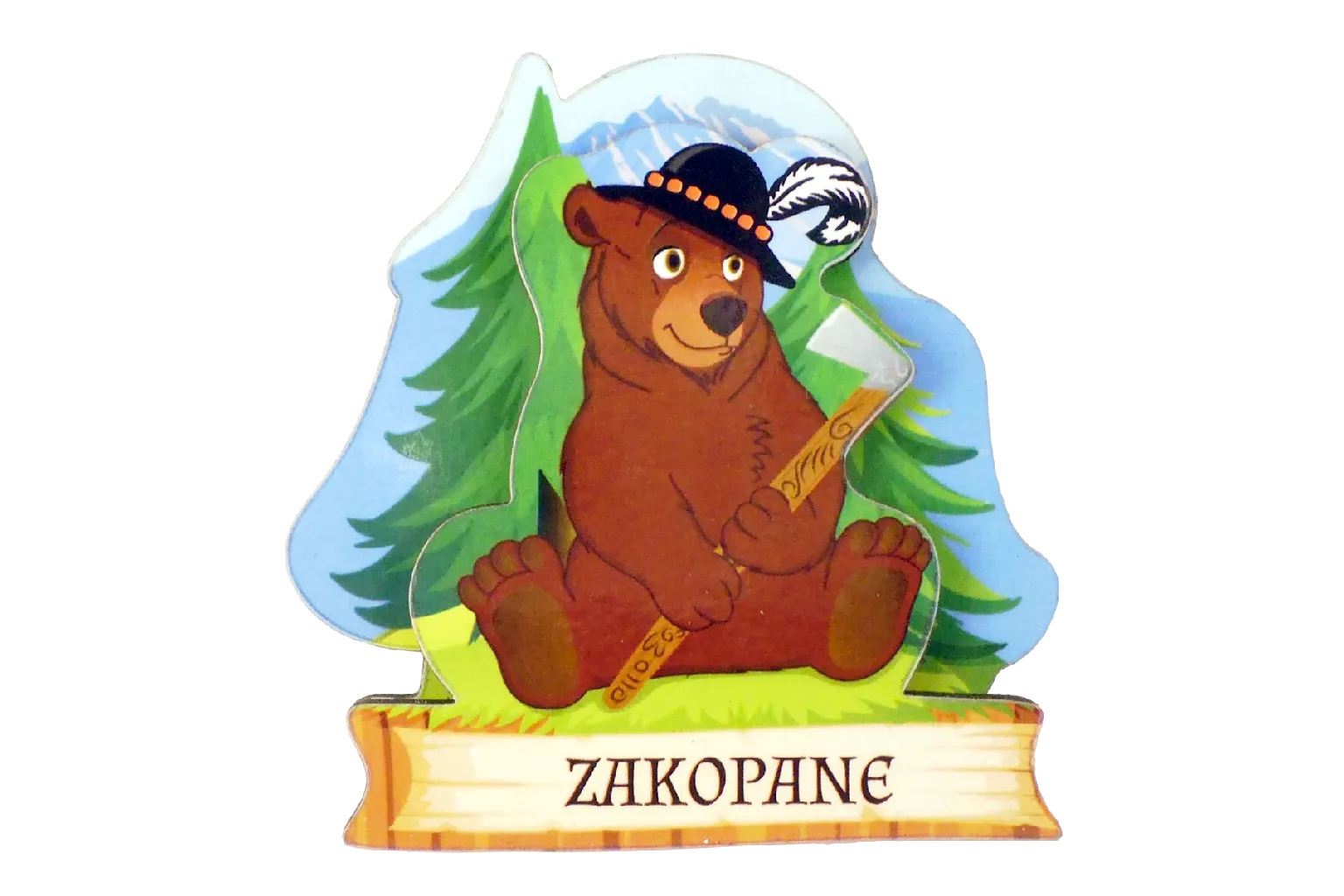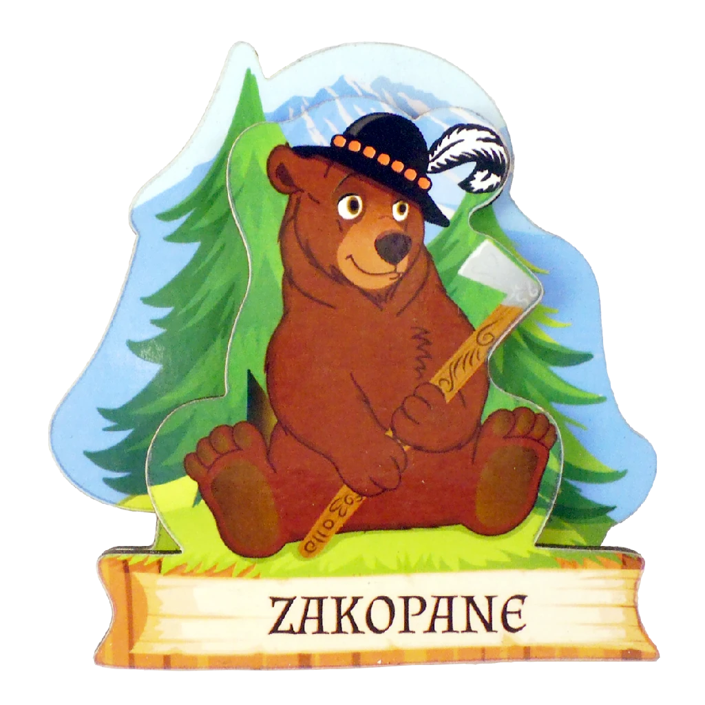 Tagi: magnes 2D, niedźwiedź, magnes ze sklejki, magnes kolorowy, niedźwiedź w kapeluszu, magnes drewniany, magnes regionalny, upominek, pamiątka, mu012