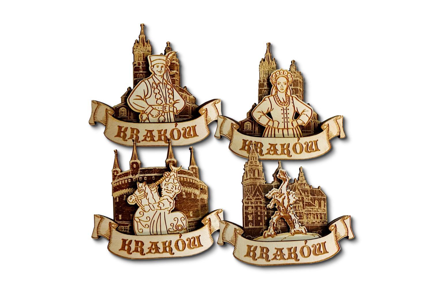 Magnesy przedstawiają charakterystyczne krakowskie motywy: stroje ludowe, zabytkową architekturę oraz symbole miasta. Trójwymiarowa forma nadaje im głębi i sprawia, że wyróżniają się na tle zwykłych, płaskich pamiątek. Ciepły odcień drewna i delikatne cieniowanie graweru tworzą elegancki, ponadczasowy efekt.