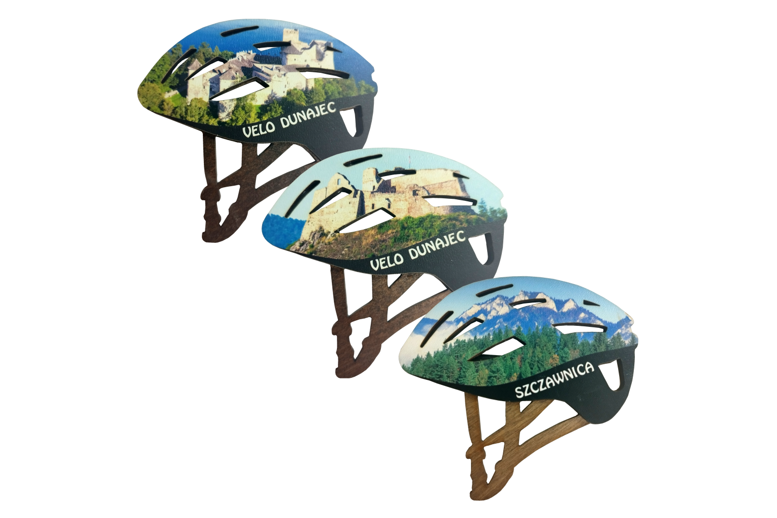 Wyjątkowy magnes na lodówkę w kształcie rowerowego kasku to doskonała pamiątka dla każdego miłośnika aktywnego wypoczynku i rowerowych wypraw! Wykonany z trwałego drewna, ozdobiony pełnokolorowym nadrukiem z widokami z różnych miejscowości turystycznych – górskie panoramy, zamki, jeziora, szlaki.