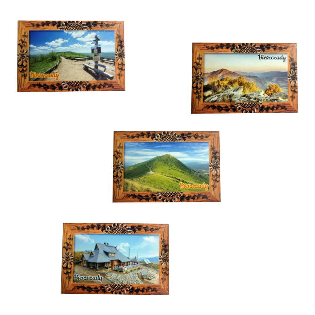 Przywołaj wspomnienia z górskich wypraw dzięki wyjątkowemu zestawowi magnesów z widokami malowniczych miejscowości. Każdy magnes ozdobiony jest dekoracyjną ramką imitującą drewno z regionalnym wzorem, co nadaje mu rustykalny i wyjątkowy charakter.