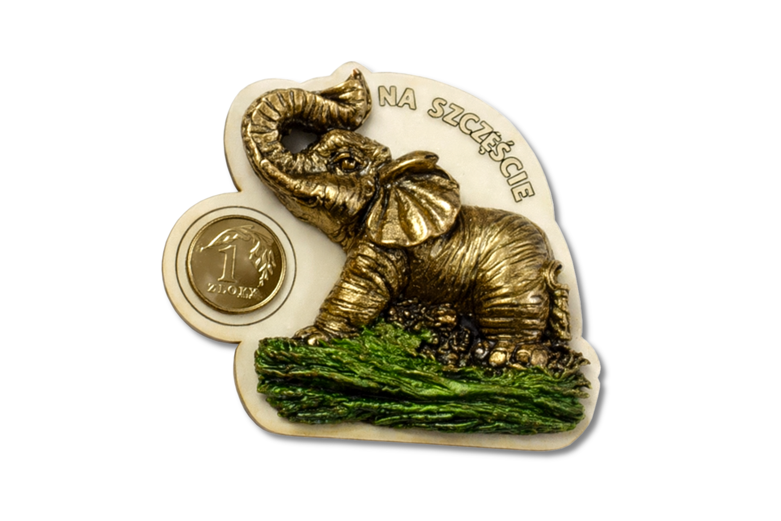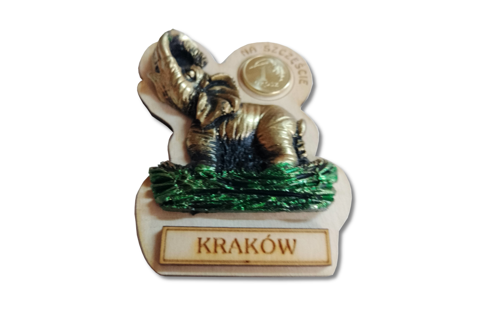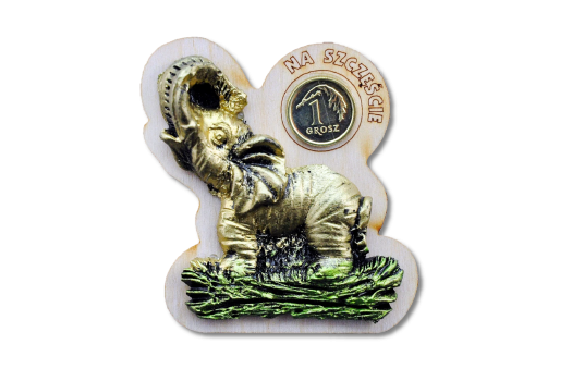 Magnes słonik na szczęście z groszem.
