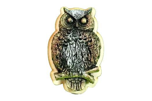 Na zdjęciu jest dekoracyjna figura przedstawiająca sowę siedzącą na gałęzi. Sowa została starannie wyrzeźbiona w drewnie, z wyrazistymi detalami, które uwydatniają jej pióra oraz charakterystyczne, duże oczy. Ciemne, lekko metaliczne wykończenie nadaje jej realistyczny wygląd, a naturalny barwy drewna dopełniaj jej charakter.
