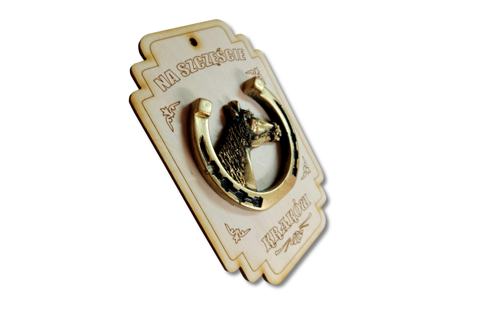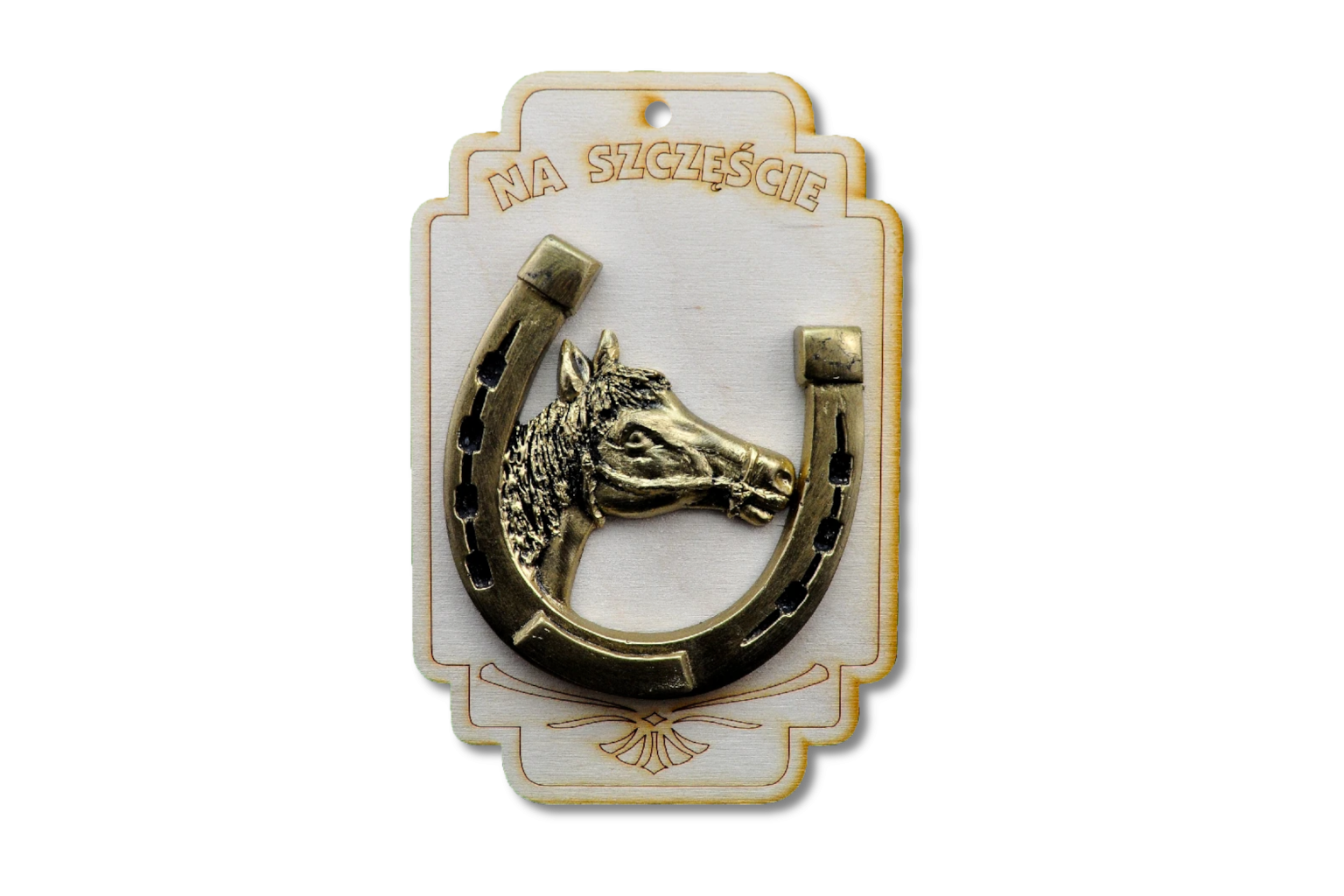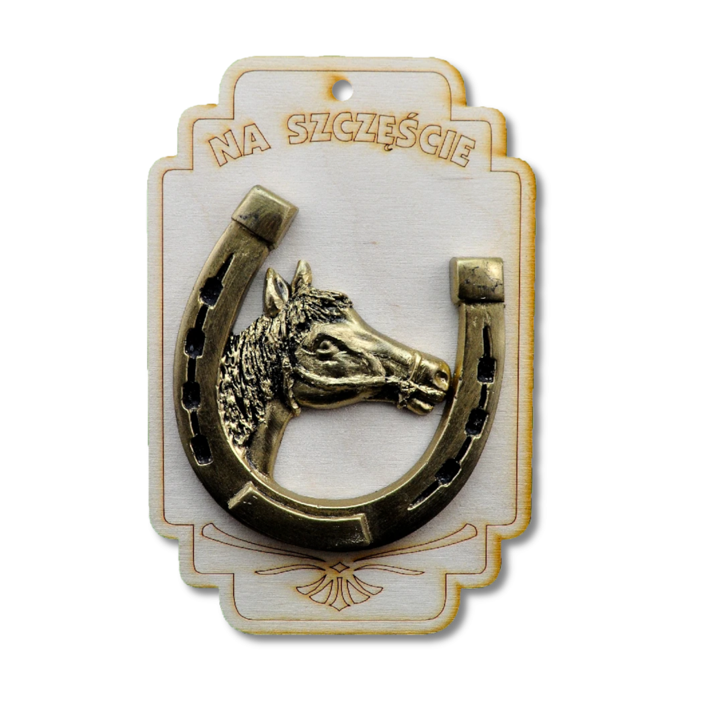 Na zdjęciu efektowny talizman w postaci podkowej z wyrzeźbionym wizerunkiem końskiej głowy. Kompozycja stosowana jest na prostokątnej, drewnianej podstawie o zaokrąglonych końcach.