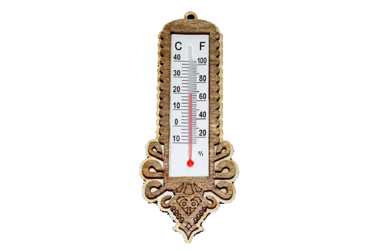 Obraz przedstawia przedmiot o rustykalnym i folkowym charakterze, łączący dekoracyjność z funkcjonalnością. Dzięki bogatej ornamentyce i zastosowaniu naturalnych materiałów, termometr idealnie pasowałby do wnętrz inspirowanych stylem wiejskim, retro lub regionalnym, podkreślając ich ciepły i przytulny klimat.