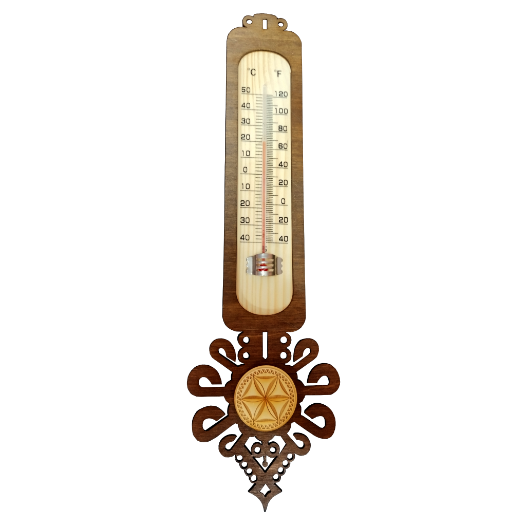 Termometr ma wyraźny styl inspirowany kulturą Podhala, doskonale łączący funkcjonalność z walorami estetycznymi. Może być pięknym akcentem w rustykalnym wnętrzu lub ozdobą w domu, który czerpie inspiracje z tradycji góralskiej. Ornamentyka i precyzyjne wykonanie czynią go wyjątkowym, przywodzącym na myśl sztukę rękodzieła.