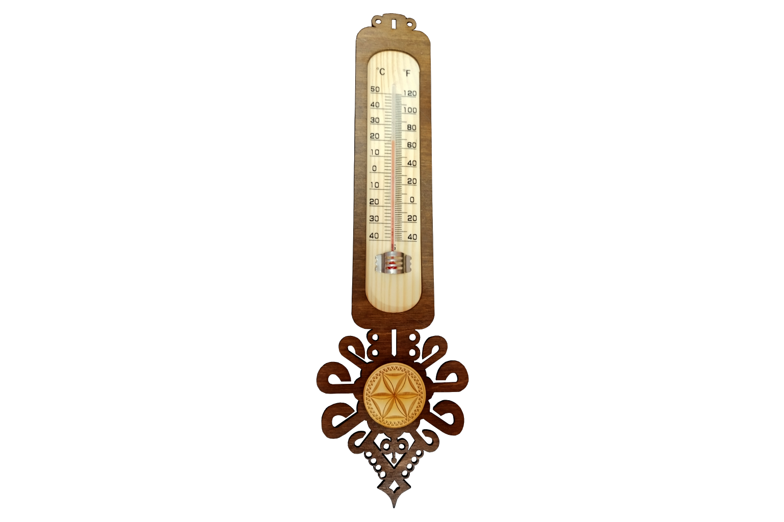 Dolna część termometru posiada misternie wycięte elementy w kształcie symetrycznych spirali, zakończone geometrycznym wzorem w kształcie rombu. Te detale podkreślają regionalny charakter przedmiotu.