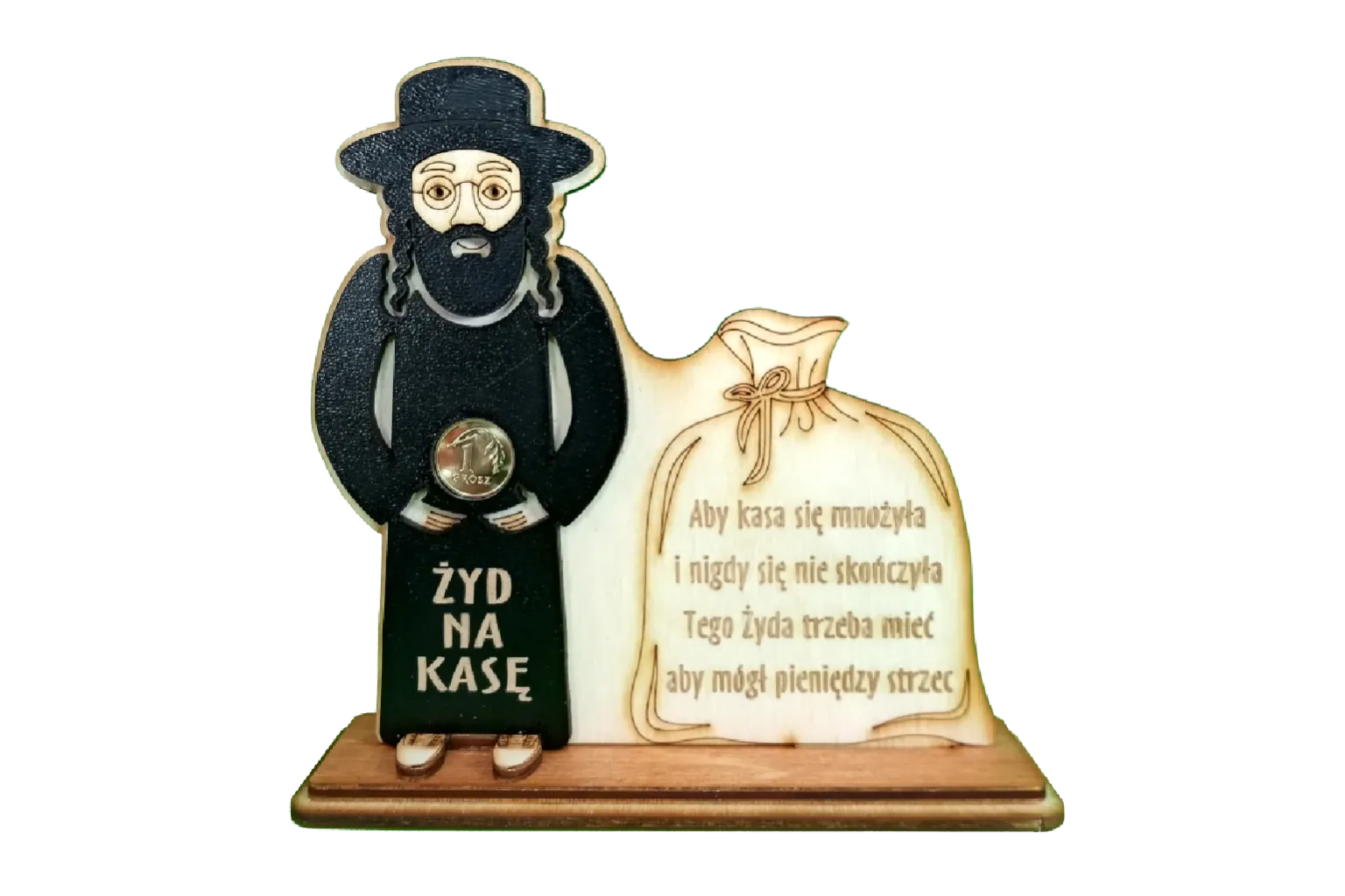 Przesłany obraz przedstawia pamiątkową dekorację zatytułowaną „Żyd na kasę”. Jest to symboliczny motyw, popularny w polskiej tradycji pamiątek turystycznych, który ma przynosić szczęście finansowe. Dekoracja składa się z dwóch głównych elementów: