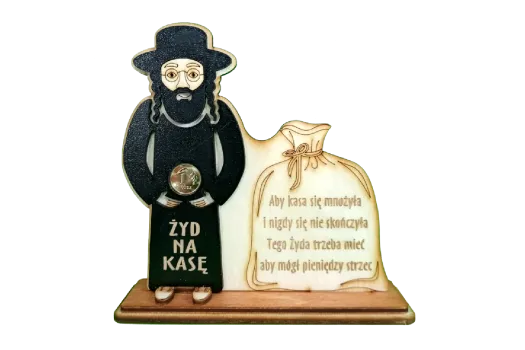 Na płaszczu widnieje napis: „ŻYD NA KASĘ”.