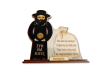 Ubrany w tradycyjny strój: czarny płaszcz, kapelusz, okulary oraz pejsy.