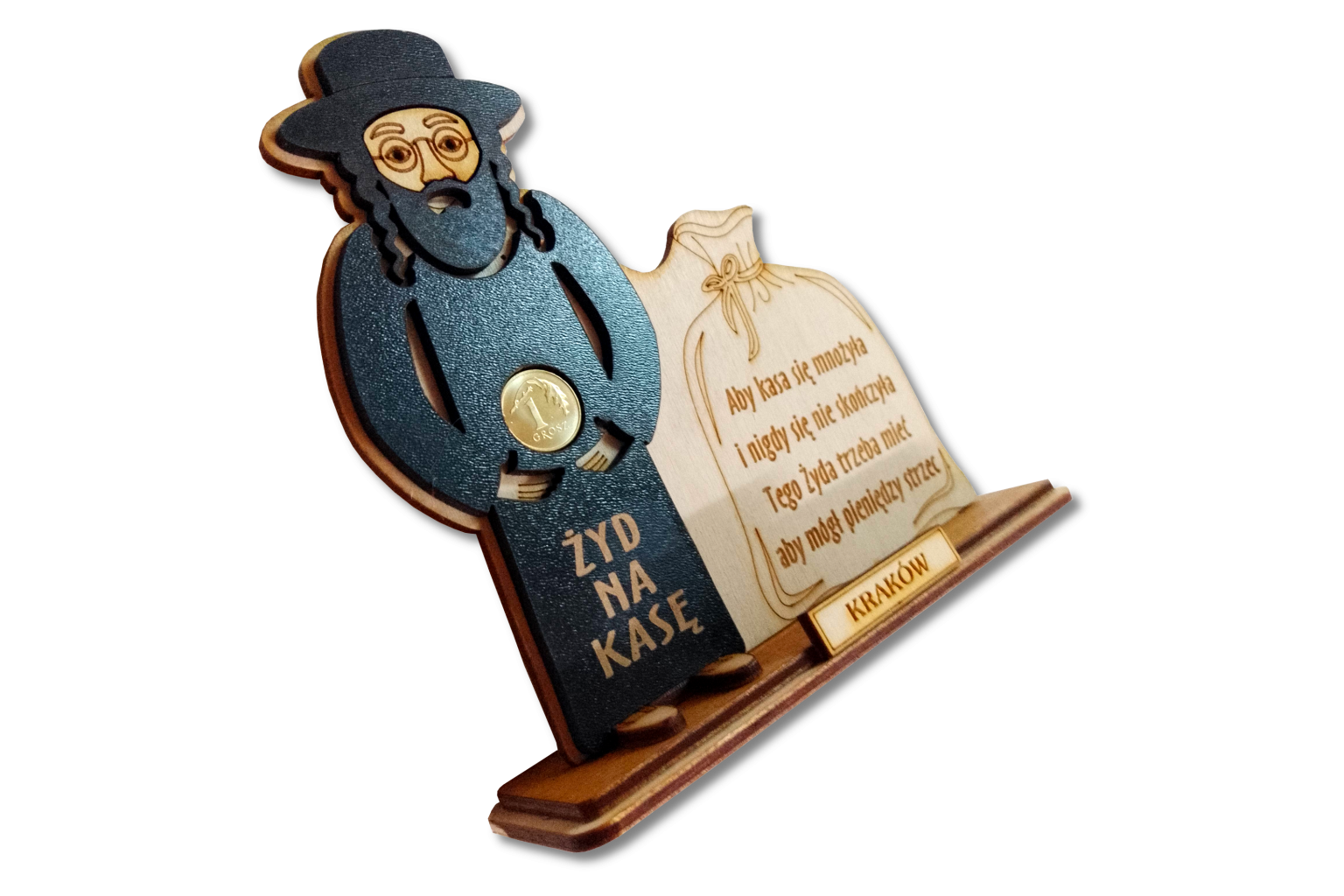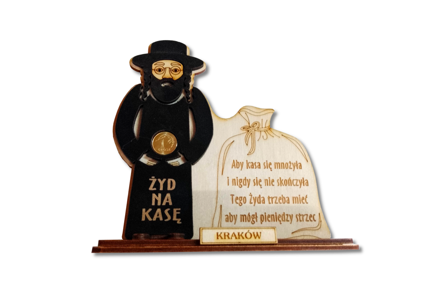 Przesłany obraz przedstawia pamiątkową dekorację zatytułowaną „Żyd na kasę”. Jest to symboliczny motyw, popularny w polskiej tradycji pamiątek turystycznych, który ma przynosić szczęście finansowe. Dekoracja składa się z dwóch głównych elementów: